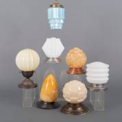 Vijf opaline plafondlampen en twee gemarmerd glazen plafondlampen