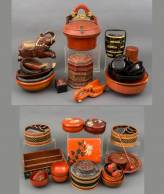 Grote verzameling rood-zwart lakwerk objecten, waaronder: dekseldoosjes en schalen, Japans, 2e helft 20e eeuw, Hindeloopen beschilderd bestekbakje, etc. -gebruikssporen-