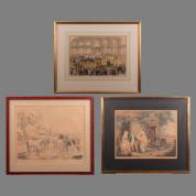 Drie kleurenlitho's in lijst: paardenshow, paarden in weiland, en boerengezin, 19e eeuw