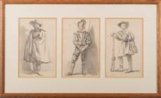 Hollandse School: drie studies van historische of maskeradefiguren, potloodtekeningen, niet gesigneerd -roestvlekjes-, 18,5 x 12 cm