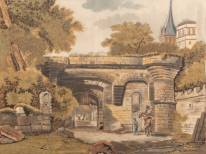 Anna Catharina Zweerisz (1794-1857), reizigers bij oude stadspoort, naaldkunst, gesigneerd, 30 x 40 cm