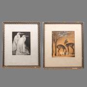 Jan Schonk (1889-1976), twee litho's: 'hertjes' en 'zilverreigers', gemonogrammeerd, 24,5 x 22 cm