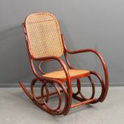 Gebogen houten schommelstoel met rietbespanning, Thonet-stijl, midden 20e eeuw, 100 x 52 x 150 cm