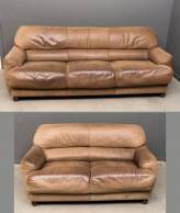 Drie- en tweezits bruin lederen banken, vermoedelijke uitvoering Bernasa, Spanje, circa 1980 -gebruikssporen-, 78 x 221 x 100 cm
