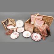 Drie ingelijste geborduurde letterlapjes, gedateerd 1910, 1913 en 1919, divers aardewerk serviesgoed met rode decoratie, Frankrijk, katoenen doek met botehmotief, Kashmir, etc., in rieten picknickmand met deksel, 49 x 60 x 43 cm