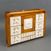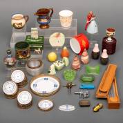 Porseleinen dienblaadje met twaalf onderzetters met nikkelen rand, spaarpotje, twaalf bakelieten onderzetters, griffeldoos, goudsteen kannetje, etc.