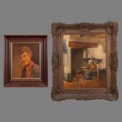 Hollandse School: portret van rokende jongen, olieverf op doek, niet gesigneerd -inschildering en verdoekt-, daarbij: Hollandse School: oude vrouw in interieur, olieverf op doek, gesigneerd Puls