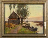 Hollandse School: boer in praam bij boerderij, olieverf op doek, gesigneerd J. de Koning, 29 x 38,5 cm
