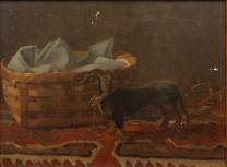 Schilderij: stilleven met speelgoedtrekwagen in de vorm van een teckel, olieverf op board, niet gesigneerd -licht verfverlies-, 23 x 31 cm