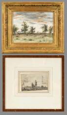 Twee tekeningen: havengezicht met figuren, inkt op papier, 18e eeuw, en ondergaande zon, kleurenpotlood op papier, gemonogrammeerd E.H. en gedateerd juli '78, 20e eeuw, 15,5 x 21 cm