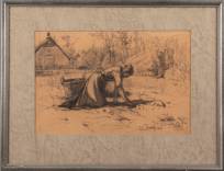 Hollandse School: vrouw werkend in een moestuin, houtskool op papier, gesigneerd C. Kool, 22 x 33 cm
