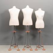 Drie paspoppen op stalen driespantpoot onderstel, waarvan één gemerkt Vendome Faubourg St Honore Paris VIII, tweede helft 20e eeuw -verweerd-, 170 cm