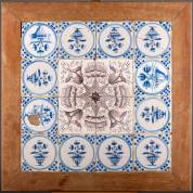 Eiken tafelblad ingelegd met 16 Delfts aardewerk tulpentegels, vier mangaanrode tegels en twaalf blauw-witte tegels -één gebroken, één met hoekje defect en één met schade-, 67,5 x 67,5 cm