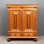 Eiken en palissandergefineerde kussenkast, met gestoken bloemdecor en gezwarte robbellijsten, in het basement twee laden, Nederland, 20e eeuw, 187 x 172 x 60 cm