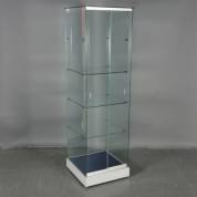 Vierkante glazen vitrinekast met vier planken, staand op houten onderstel met wieltjes, laatste kwart 20e eeuw, 171 x 50 x 50 cm
