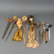 Kris met messing schede, Java, sewar-dolk, Sumatra, en piha kaetta-dolk, Sri Lanka, en twee wayangpoppen