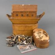 Houten ark -één paneel defect-, en twee spanen dozen met houten speelgoeddieren en enkele figuren, 19e eeuw -defecten-