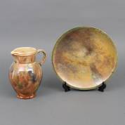Lusterglazuur raku keramiek schaal, gemerkt met sticker 'V.O.F. de Pottenbakkerij', Breda, daarbij: geglazuurde keramiek schenkkan, niet gemerkt, Ø 33 cm