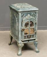 Grijsblauwgeglazuurde gietijzeren kachel, uitvoering Deville, Charleville -binnenwerk ontbreekt-, 62 x 44 x 31 cm