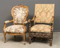 Gebeitst beuken voltaire met gros-point bekleding, biedermeierstijl, en notenhouten armstoel met geweven bekleding, Louis Quatorze-stijl -defecten aan bekleding-, 107 x 59 x 78 cm