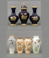 Twee porseleinen vazen met polychroom vogeldecor, driedelig porseleinen kaststel met blauw-goud bloemdecor, en paar glazen vazen met emailleverf bloemdecor, 31 cm