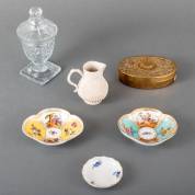 Drie porseleinen schaaltjes, uitvoering Meissen, glazen dekselbokaal, Staffordshire zoutglazuur steengoed schenkkannetje, Engeland, 18e eeuw, en ovale messing doos met hanendecor