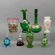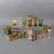 Diverse gekleurde, geslepen en beschilderde drinkglazen, 17 cm