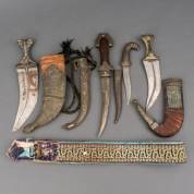 Twee kromdolken en ceintuur, Jemen, kromdolk met metalen schede, voorzien van gouden appliques, Marokko, en dolk met heft in de vorm van een schaap, Egypte