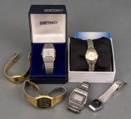 Zes stalen quartz horloges, waaronder: twee Seiko met doos en papieren