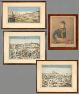 Vier ingekleurde gravures: Napoleon, gezicht op Londen vanaf het water, en tweemaal slagveld, 27 x 38 cm