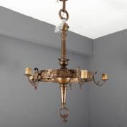Messing hanglamp met vijf armen rond centrale ring, het geheel voorzien van acanthusbladdecor, circa 1900 -twee armen gesoldeerd, maar weer los gekomen-, 133 x 93 x 93 cm