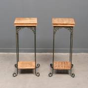 Paar ijzeren plantentafeltjes met houten bladen, 67 x 27 x 27 cm