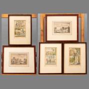 Vijf kleine gravures in lijst, waarvan drie met afbeeldingen van figuren die een activiteit beoefenen, en twee van gezichten te Utrecht, 19 x 22,5 cm