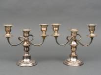 Paar verzilverde drielichts kandelabers met parelrand, à double usage -deels door verzilvering heen gepoetst-, 21 x 25 x 11 cm