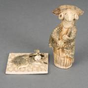Mariet Schmidt (1935), twee keramiek beeldjes: ram in kleding -stukje van kleed afgebroken-, en liggende figuur op tegel, gemonogrammeerd, 14,5 cm