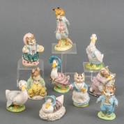 Tien keramische Beatrix Potter-figuren: 'Jemima Puddle-duck', 'Foxy Whiskered Gentleman', 'Jemima Puddle-duck Made a Feather Nest', 'Tabitha Twitchit', 'Cousin Ribby', 'Samuel Whiskers', 'Tom Kitten', 'Rebecca Puddle-duck', 'Mr. Drake Puddle-duck', en 'Tabitha Twitchit & Miss Moppet', alle uitvoering John Beswick, Royal Doulton, Engeland