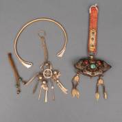 Lederen tasje aan lederen band met metalen beslag, ingelegd met bloedkoraal en turkoois -kwastje los-, metalen halssieraad en metalen chatelainehanger, Miao, Zuidoost-China