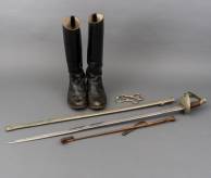 Cavalerieofficierssabel met rechte kling, verchroomd opengewerkt gevest met bloemmotief, en handgreep van eboniet, Weijersberg en Kirschbaum & Co., gemerkt, daarbij: paar lederen paardrijlaarzen, maat 43, twee metalen trekhaken, en lederen zweepje -uiteinde defect-, 103 cm