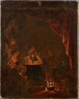 Hollandse School: interieur met figuren bij kaarslicht, olieverf op doek, onduidelijk gesigneerd, 19e eeuw -defecten-, 50 x 40 cm