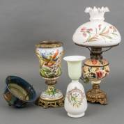 Porseleinen olielampvoet met polychroom vogeldecor en messing beslag, circa 1900 -incompleet-, daarbij: porseleinen olielamp met opaline kap op messing basement -geëlektrificeerd-, wit glazen vaas met polychroom decor, en plateel aardewerk hangpot, 53 cm