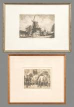 Twee etsen: Waalko Jans Dingemans II (1873-1925), paardenmarkt, en 'Rotterdam - Molens aan Plaszoom (20)', onduidelijk gesigneerd, 17 x 24 cm