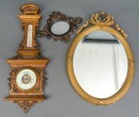 Ovale geslepen spiegel in goudkleurige striklijst, ovaal spiegeltje in gestoken houten lijst, en thermo- barometer in rijk gestoken houten kast, 76 cm
