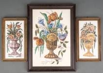 Zespas aardewerk tegeltableau met polychroom floraal decor, daarbij: twee tweepas aardewerk tegeltableaus met floraal decor, Koch, Workum, 1974, 39,5 x 26,5 cm