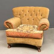 Groot formaat fauteuil met gecapitonneerde rug en bekleed met drie diverse bruine stoffen, tweede helft 20e eeuw, 97 x 118 x 100 cm