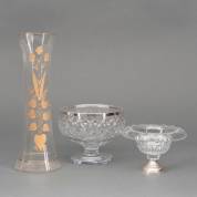 Kristallen schaal met 2e gehalte zilveren rand, kristallen schaal op 2e gehalte zilveren voet, en glazen vaas met verguld bloemdecor