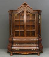 Wortelnoten porseleinkast bekroond door gestoken kuif, staand op bolklauwpoten, Nederlands, tweede helft 20e eeuw, 218 x 170 x 45 cm