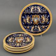 Serie van vier aardewerk borden en een schotel met polychroom decor in renaissancestijl op blauw fond, uitvoering Gien, Frankrijk, Ø 30,75 cm
