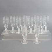 Serie van tien champagneflûtes met geslepen bladerdecor en dubbele knop in de stam, 17 cm