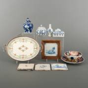 Porseleinen Imari bordje en schaaltje, porseleinen dekselpotje, vier aardewerk tegels -defecten-, twee dekselpotjes en een vaasje met blauw-wit decor, en porseleinen dienblaadje met tinnen rand