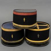 Drie Franse militaire kepi's, model M1935: artillerie soldaat, artillerie officier, en onbekend, alle 20e eeuw -gebruikssporen-, 11 x 21,5 x 18 cm